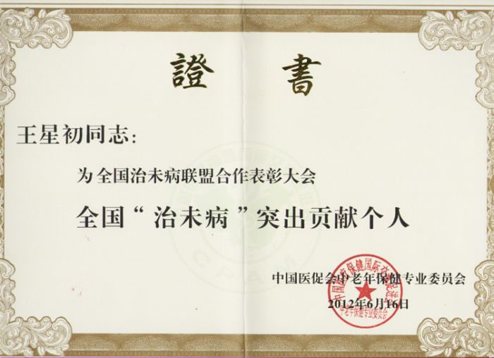 中国医促会中老年保健专业委员会首席专家、杭州双马生物医学专家组组长王星初院长长期致力于保健知识的宣传与普及,为人类健康的发展做出了突出贡献,被全国治未病联盟合作表彰大会评选为全国“治未病”突出贡献个人。