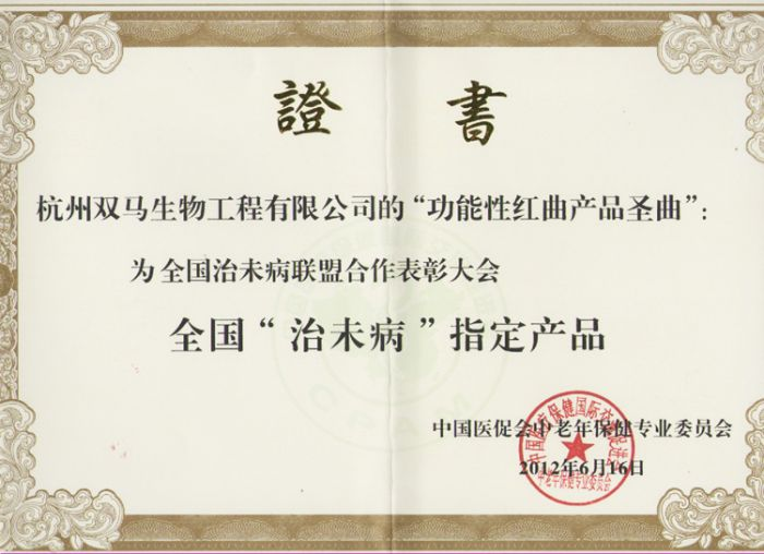 作为国际功能性红曲产业的先行者,杭州双马生物工程有限公司研发的“圣曲”产品为人类心脑血管疾病的防治做出了巨大的贡献,不但弘扬了中国千年红曲文化,还推动红曲产业跨越式的发展,得到了社会各界一致的认可与好评,并在全国治未病联盟合作表彰大会上荣获为全国“治未病”指定产品。